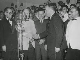 Conocedor del idioma español, Edward G. Robinson le da un apretón (de mano) a Tita Merello. Mary Pickford observa año 1954